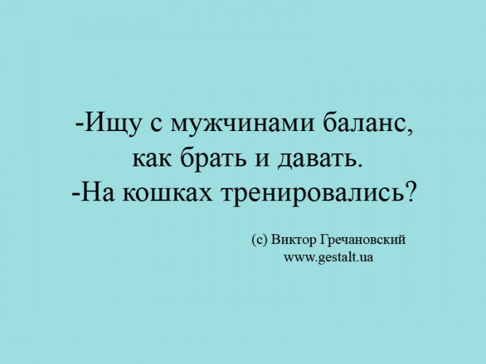 -Ищу с мужчинами баланс, как брать и давать.-На кошках тренировались?