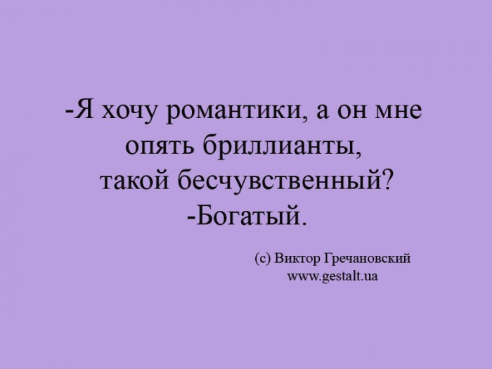 -Я хочу романтики, а он мне опять бриллианты, такой бесчувственный? -Богатый.