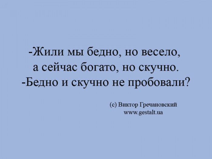 -Жили мы бедно, но весело, а сейчас богато, но скучно.-Бедно и скучно не пробовали?