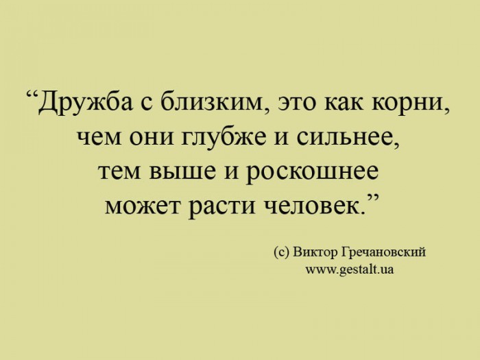 “Дружба с близким, это как корни, чем они глубже и сильнее, тем выше и роскошнее может расти человек.”(с) Виктор Гречановский www.gestalt.ua
